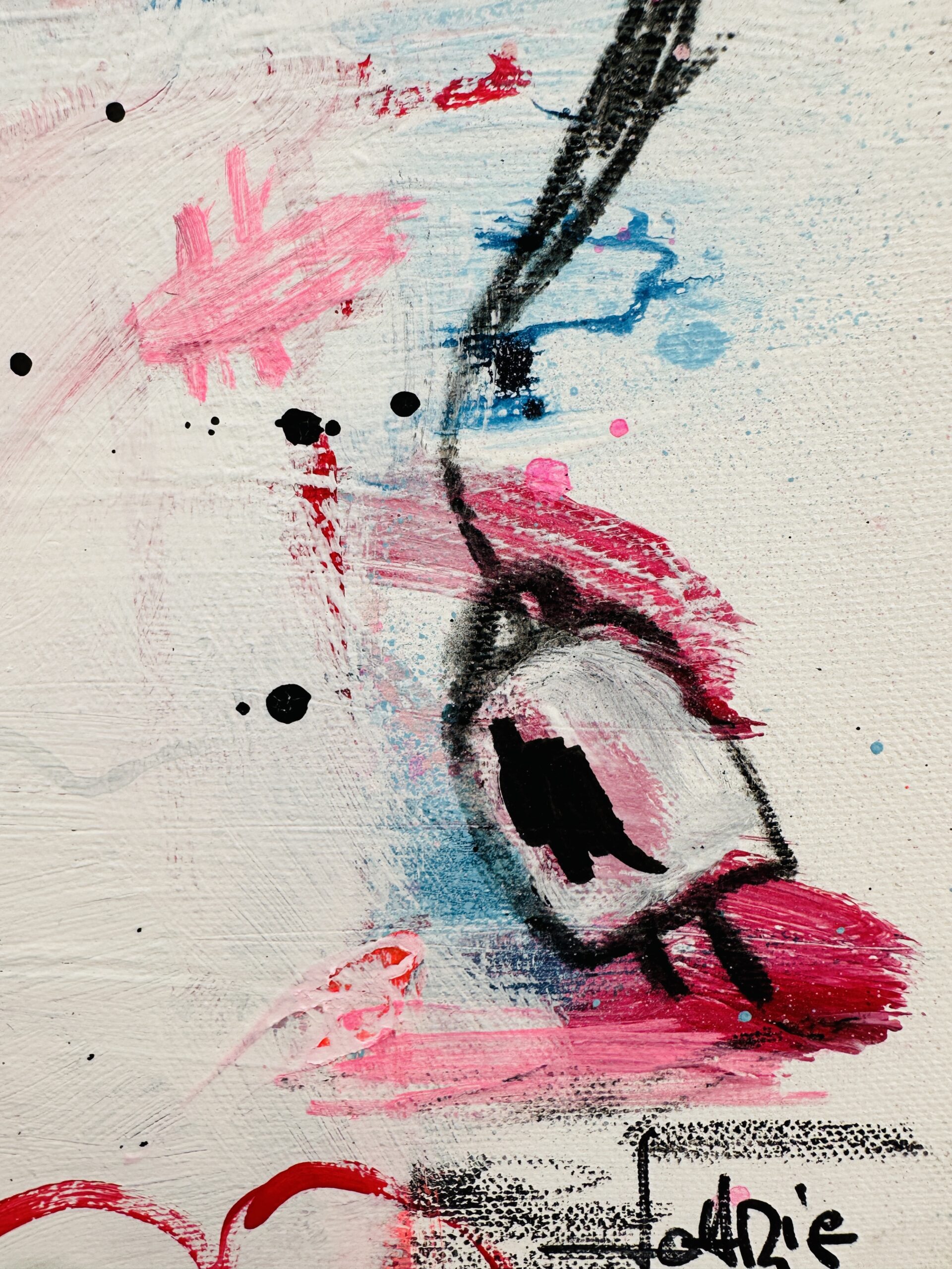 Ein tänzerischer Balanceakt zwischen Farbe, Form und Linie, Fläche und Raum, Abstraktion und Gegenstand, Bild und Schrift. Die Leichtigkeit ist es, die uns in Lohrigs Werken entgegenspringt. Die Farben mit Lust aufgetragen, werden häufig mehrfach überarbeitet; immer bleiben die Spuren der unteren Schichten wahrnehmbar. Sie arbeitet mit Sprühfarben, Neon, pink.