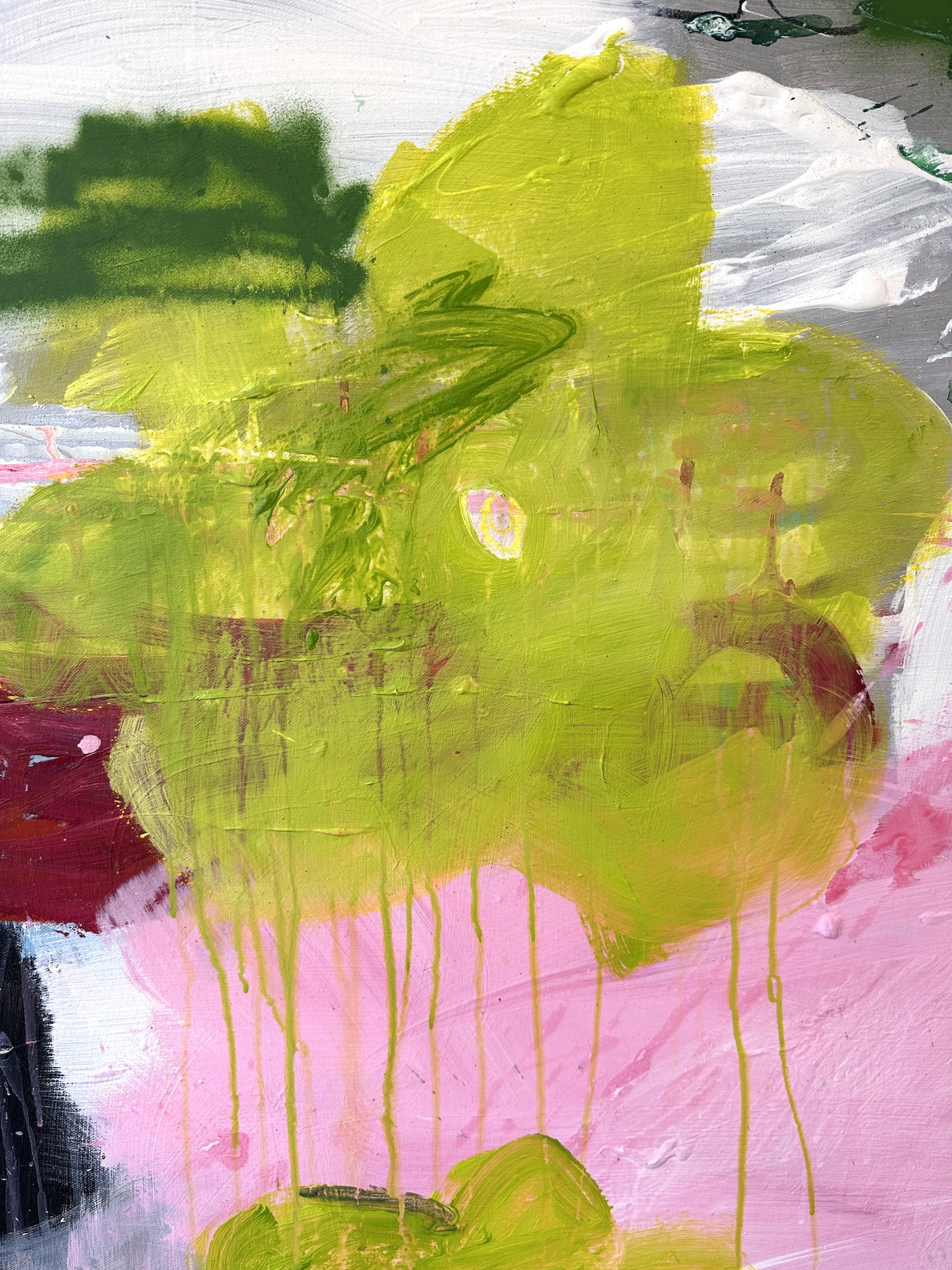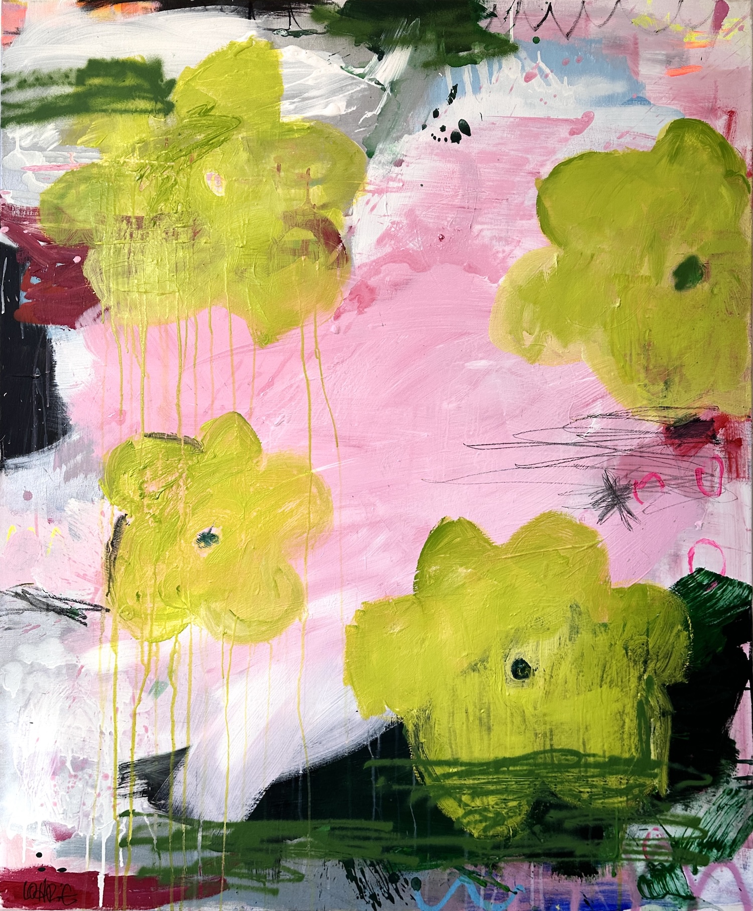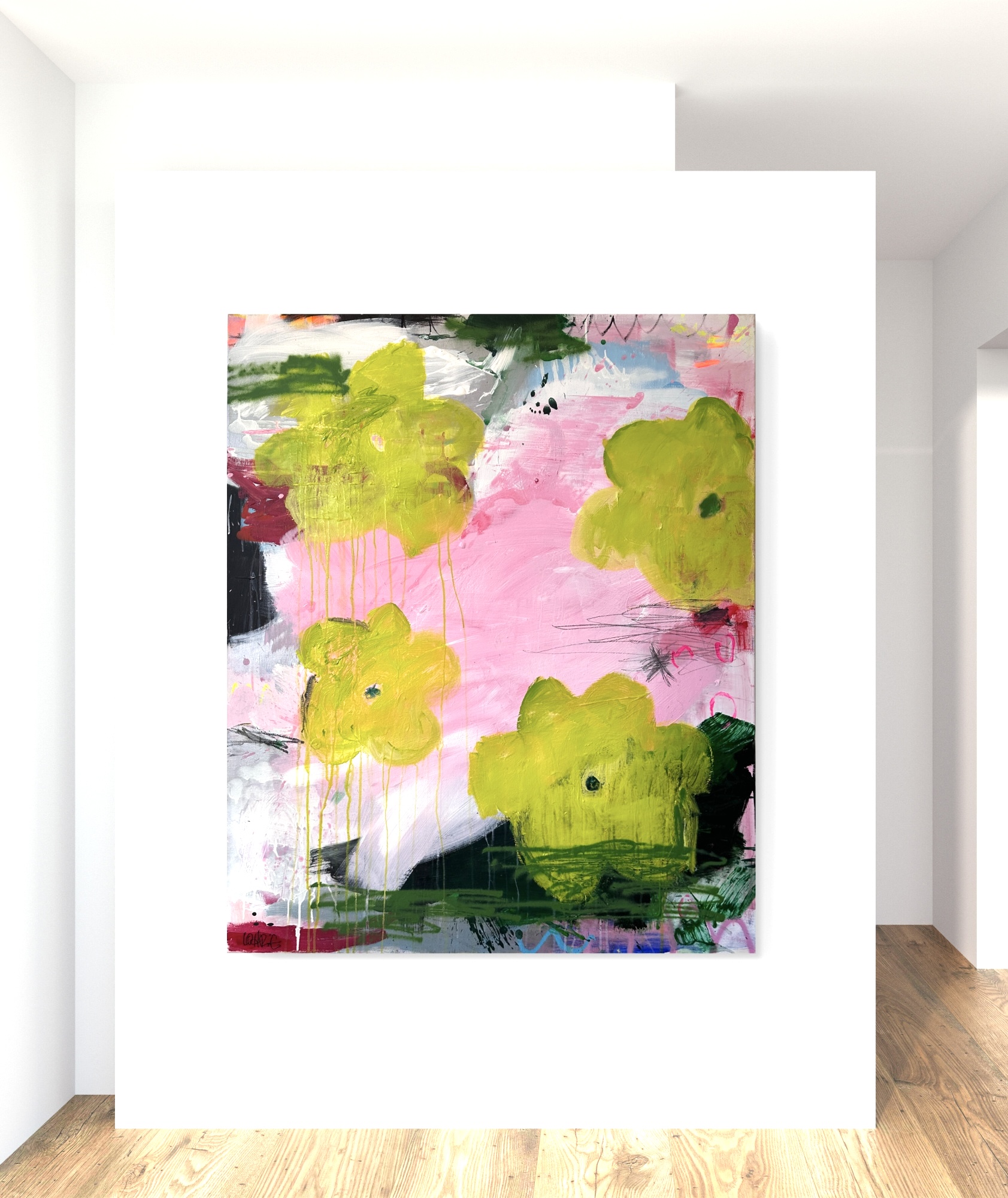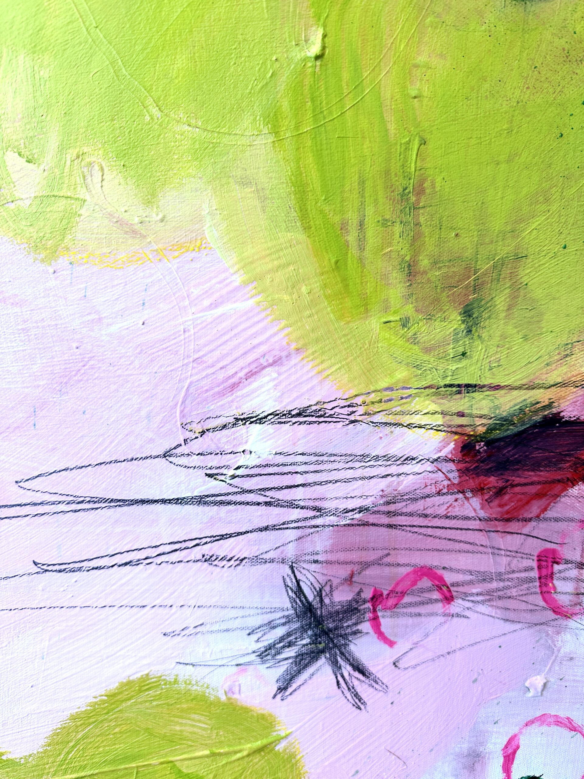 Ein tänzerischer Balanceakt zwischen Farbe, Form und Linie, Fläche und Raum, Abstraktion und Gegenstand, Bild und Schrift. Die Leichtigkeit ist es, die uns in Lohrigs Werken entgegenspringt. Die Farben mit Lust aufgetragen, werden häufig mehrfach überarbeitet; immer bleiben die Spuren der unteren Schichten wahrnehmbar. Sie arbeitet mit Sprühfarben, Neon, pink.