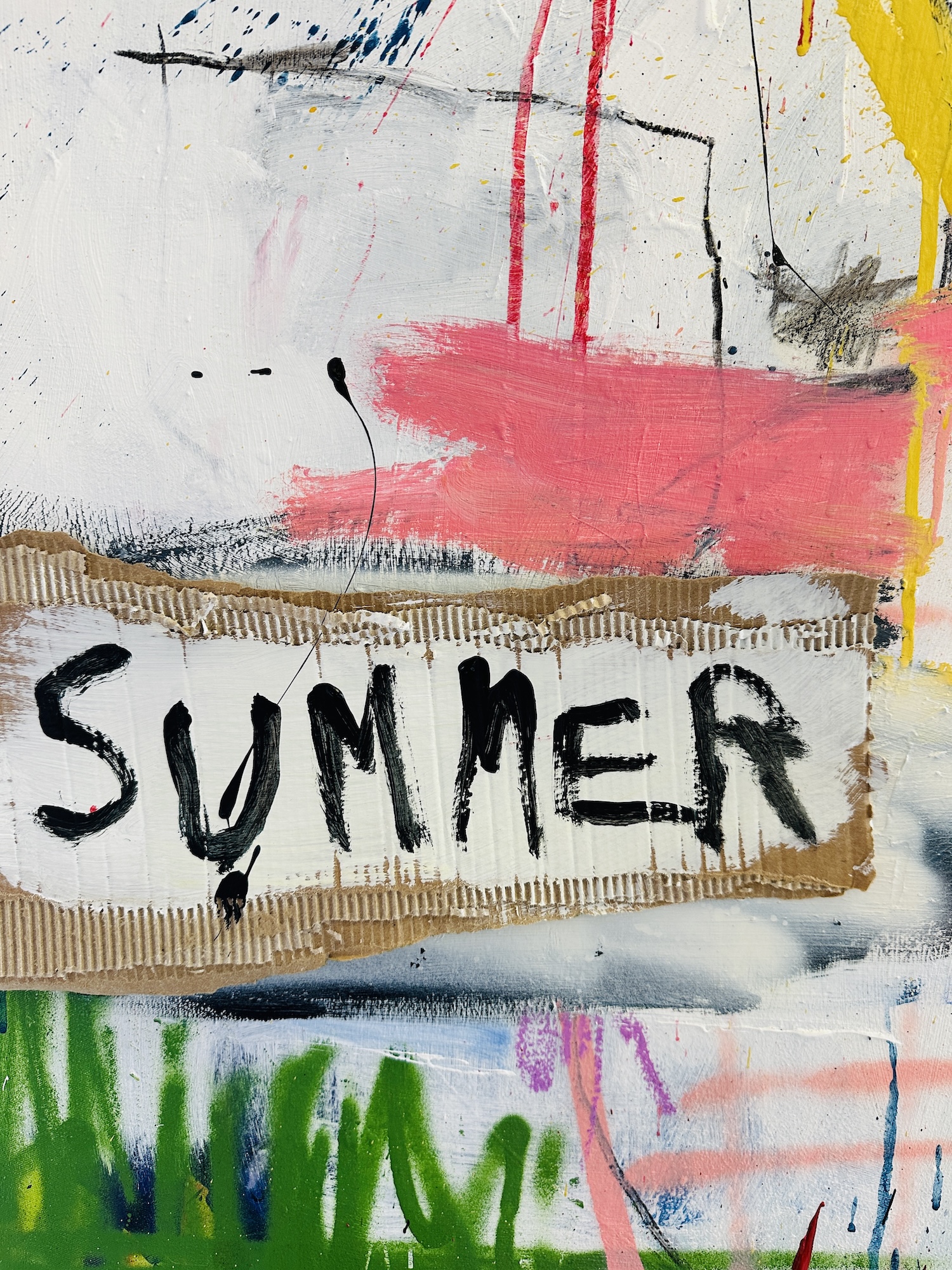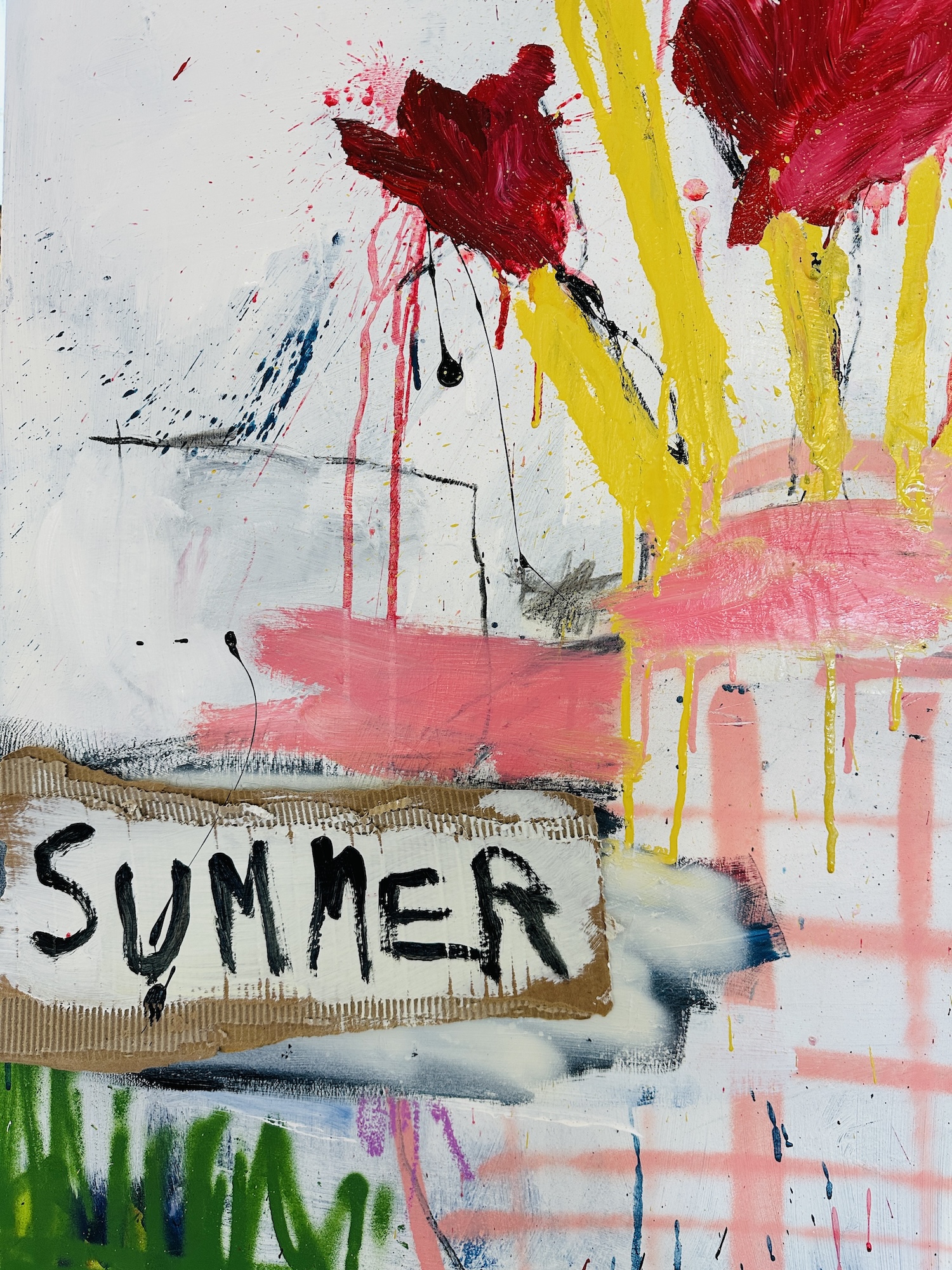 Ein tänzerischer Balanceakt zwischen Farbe, Form und Linie, Fläche und Raum, Abstraktion und Gegenstand, Bild und Schrift. Die Leichtigkeit ist es, die uns in Lohrigs Werken entgegenspringt. Die Farben mit Lust aufgetragen, werden häufig mehrfach überarbeitet; immer bleiben die Spuren der unteren Schichten wahrnehmbar. Sie arbeitet mit Sprühfarben, Neon, pink.